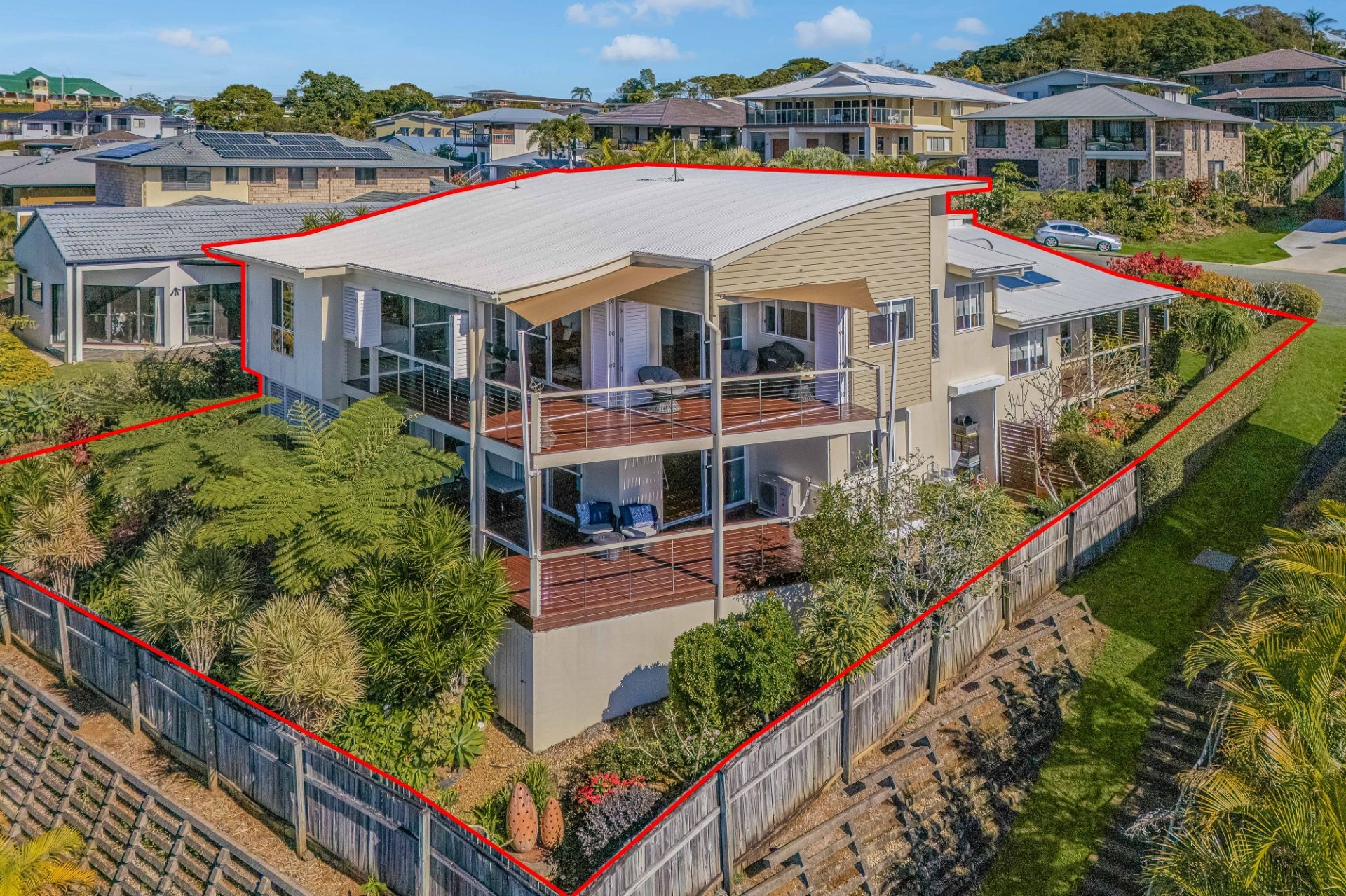 Infusing modern coastal Architecture with its sleek ocean wave roofing and designed to capture the North Easterly scenic views, this impressive 5-bedroom residence split over 3 distinctive levels, offers a myriad of lifestyle options including dual living.