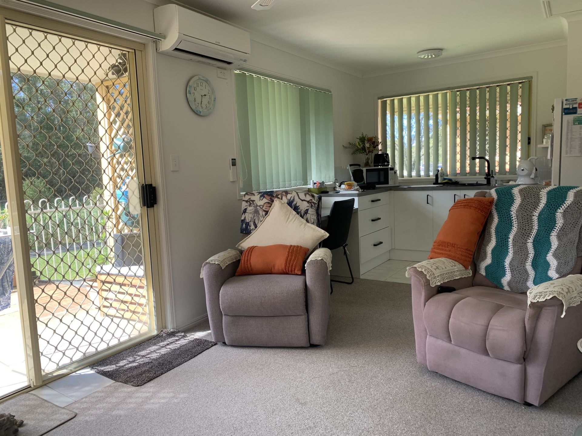 • Spacious carpeted Air-conditioned living area which flows to the undercover outdoor patio overlooking the water and reserve.