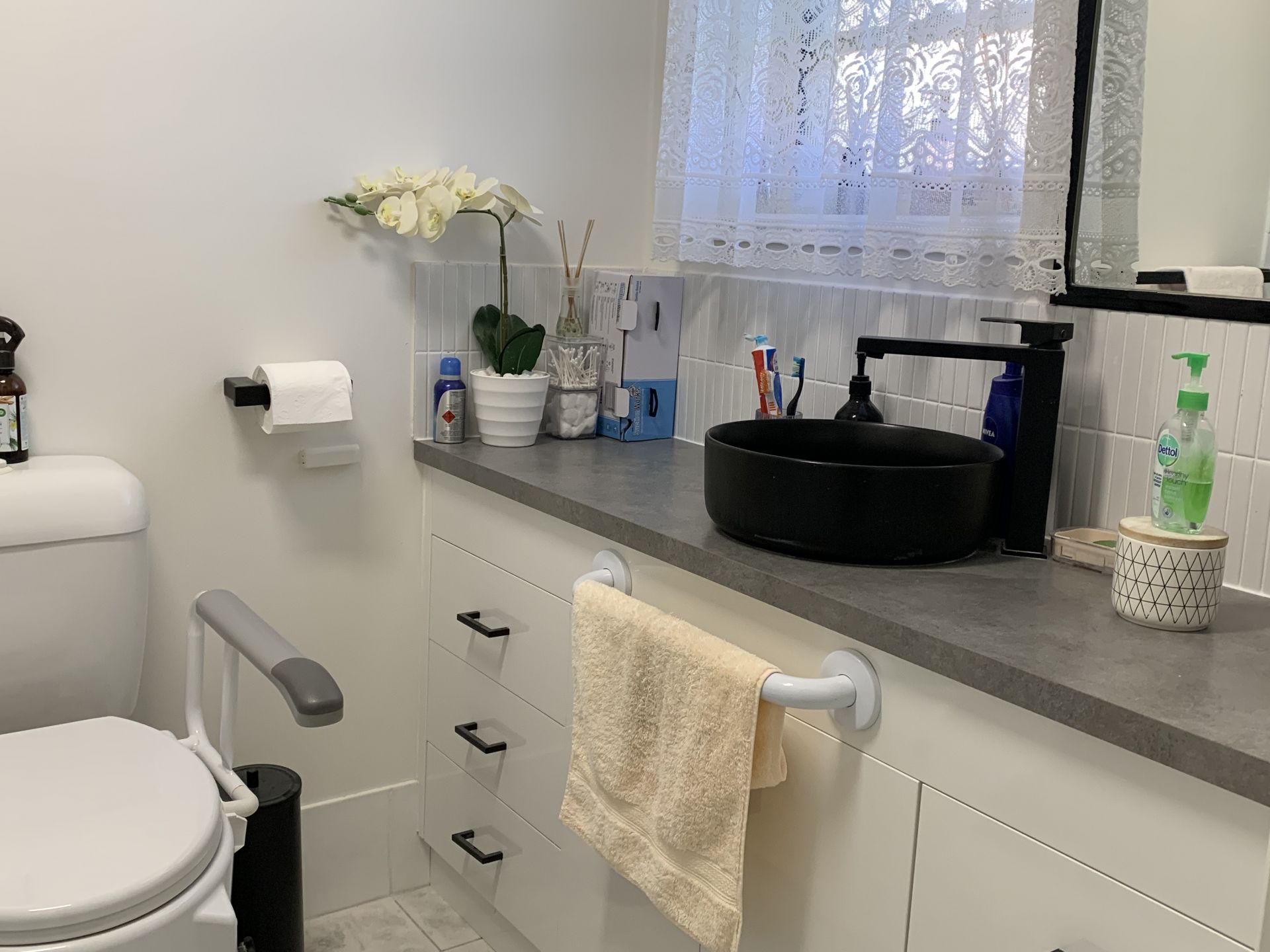 • Modern spacious bathroom with combined laundry