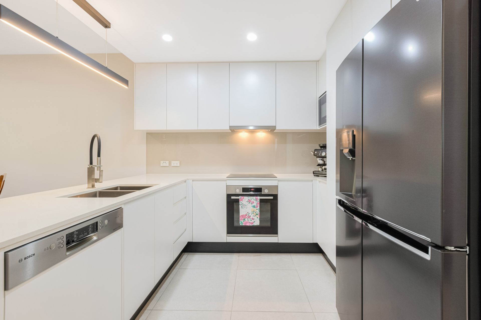 - Hostess kitchen w/ Bosch appliances, island bench, self-closing cabinetry & ice maker refrigerator
